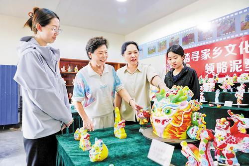 9月17日,玉田县文化馆工作人员(右二)向参观者介绍玉田泥塑作品。河北日报记者 师源 摄