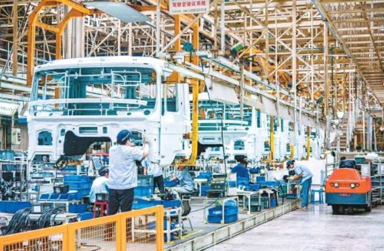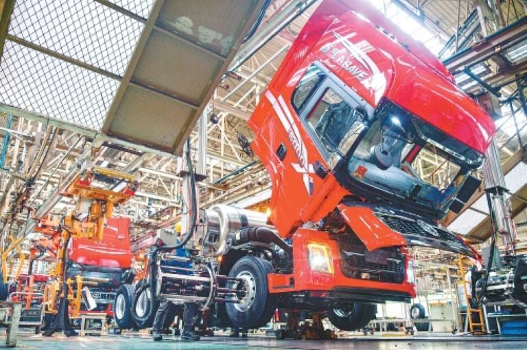 在陕西汽车控股集团有限公司(以下简称“陕汽”)总装厂,流水线分钟就有一辆重卡下线,这些车辆将从西安出发,驶向全球150多个国家的建设工地。