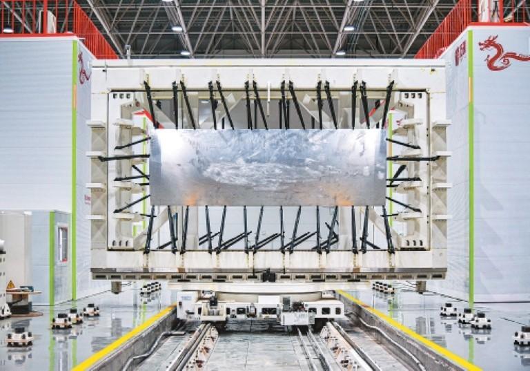 在新建成的先进航空零部件智能互联制造基地,记者看到了亚洲规模最大的8套蒙皮双五轴镜像铣设备。蒙皮板材被固定在大型设备上,两面刀头镜像对称运动,一面切削,一面支撑,实现精准铣削。“现在,我们将加工精度稳定控制在了±0.1毫米!就像给飞机蒙皮做精密雕刻,以前是‘大刀阔斧’,现在则是‘精雕细琢’。”三角防务一位操作工程师说,数据最有说服力,使用镜像铣替代传统化学铣工艺,每加工1000张蒙皮,节电约10万千瓦时,减排重金属及酸碱污染物约660吨,实现零排放。