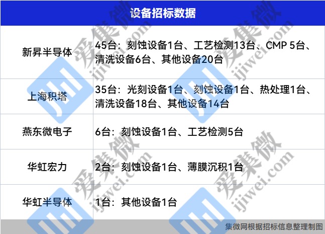 本周,新昇半导体新增设备招标45台,上海积塔新增设备招标35台,燕东微电子新增设备招标6台,华虹宏力新增设备招标2台,华虹半导体新增设备招标1台;北方华创新增中标设备5台,芯矽科技新增中标设备2台,华海清科新增中标设备1台,Nova新增中标设备1台。