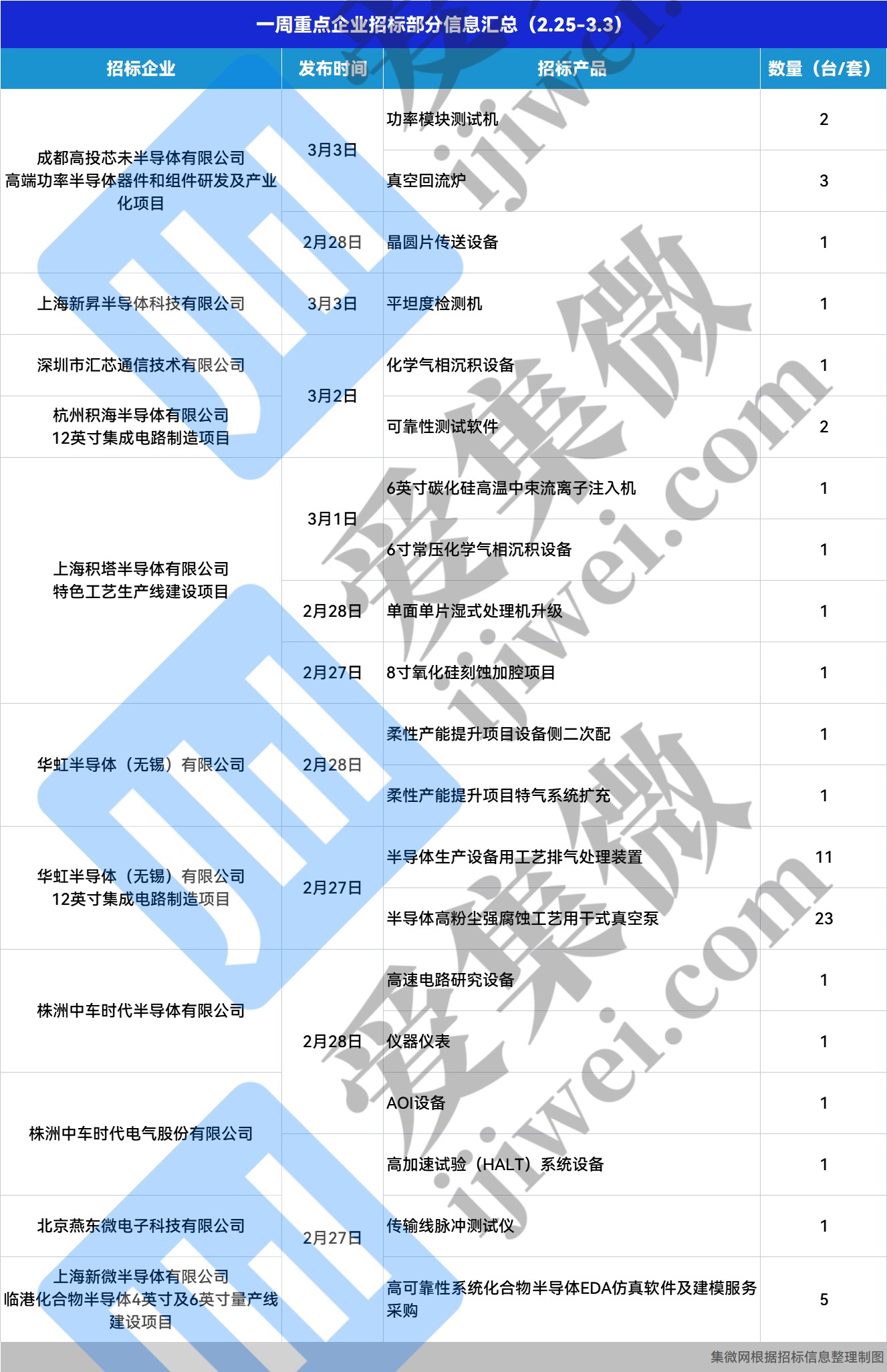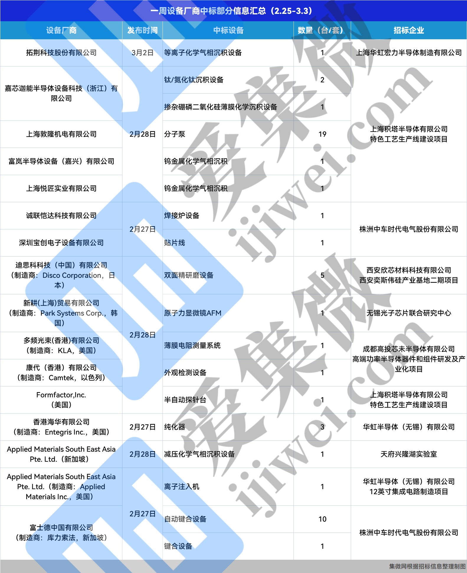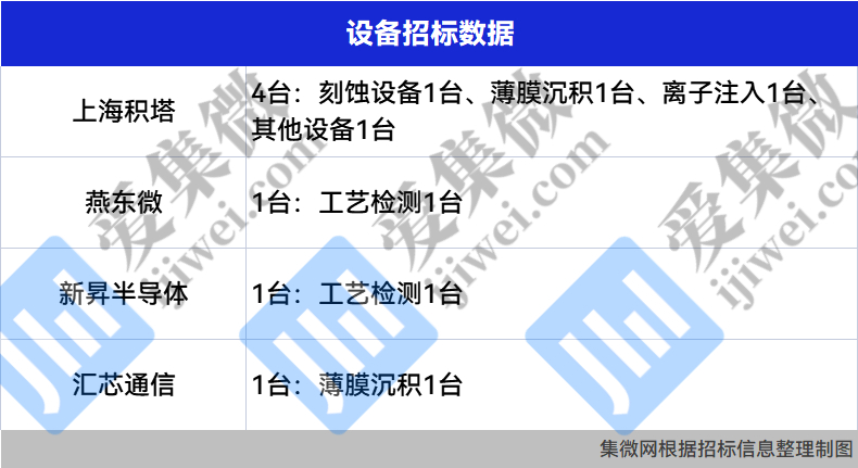 5.【一周招/中标】嘉芯迦能新增中标设备3台,拓荆科技新增中标设备1台,上海积塔新增设备招标4台